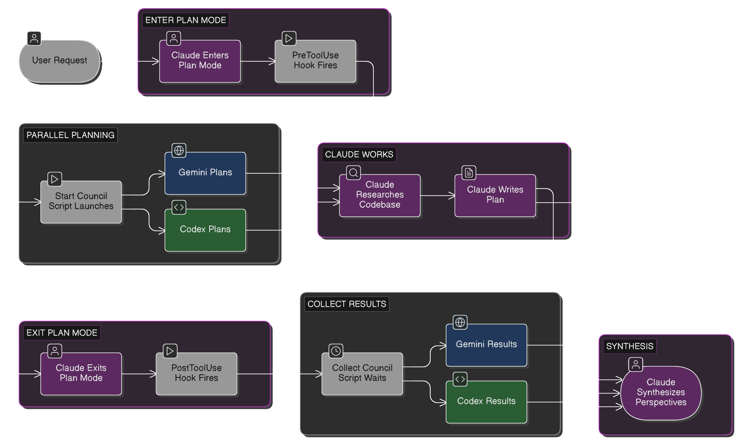 use /council explicitly for architecture decisions. let automatic hooks handle the rest, but know you can always proceed without waiting.